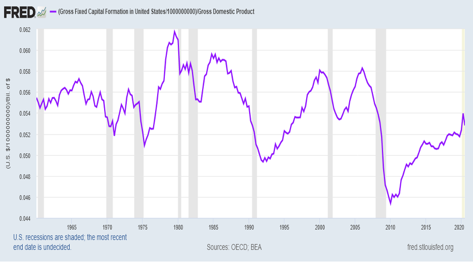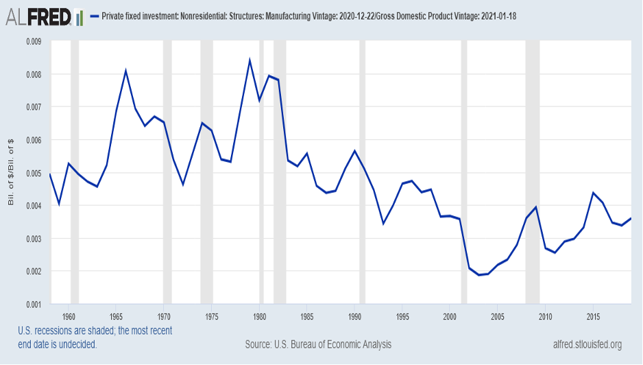 And the U.S. remains among the Top 2 countries granted patents on a global basis. With rising political pressure on corporations to construct more manufacturing plant in the United States, starting under the Obama Administration, Manufacturing Investment relative to GDP appears to have bottomed and entered a long term uptrend: