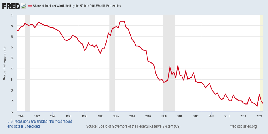 This collapse in Manufacturing and Manufacturing Jobs created a truly deleterious impact on Median Family Income. This can be seen in the collapse in Net Worth for the Middle Class families in the 50th Percentile to 90th Percentile of the Income Strata: