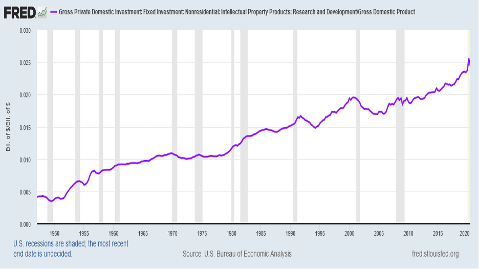 To meet these two critical challenges, the Trump Administration spent its 4 years focused on putting the intellectual foundation in place to support The National Interest. And, with the support of Congress, it expanded the role of committees, such as CFIUS, and strengthened administrative procedures to begin to address Corporations acting in ways that conflicted with the interests and goals of the United States. Over time, as these actions and procedures become embedded in the economy, coupled with new technologies reaching commerciality and thus able to drive economic growth, these policies will create a large impact on overall US growth. In the meantime, fortunately for the United States, the country remains a Research & Development (R&D) powerhouse. Despite stagnant government funding of R&D, overall R&D compared to U.S. GDP continues to grow at a steady rate: