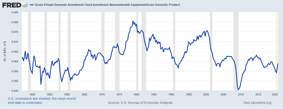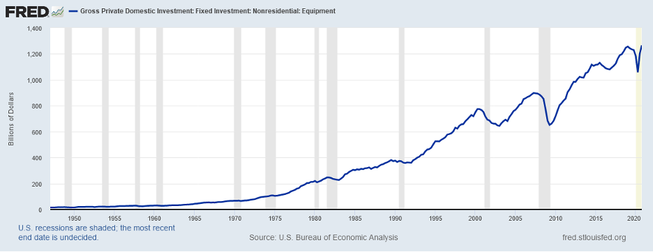 This basing pattern appears similar to post-World War II, when the country passed through a period of lower Equipment Investment after the massive investment that occurred during the war. With Equipment to GDP bottoming, actual dollars of Industrial Equipment Investment continue to reach new heights: