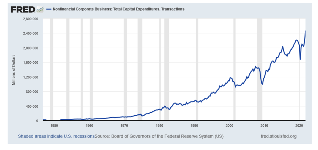 While this level of spending will return spending to where it needs to be, it will not make up for the deficit from 2012 – 2018.  In addition, with geopolitics now producing a large shadow over all government decisions, National Security will continue to rise as a critical component of all government policy.  Private Capital Spending will likely become the main channel of transmission for this policy.  This will occur as the Federal Government moves to re-shore production from overseas for technology, to shore up the US industrial base, and to ensure the US gets its fair share of future production for new critical industries such as Electric Vehicles.  Overall capital spending already headed upward this cycle, reaching new heights: