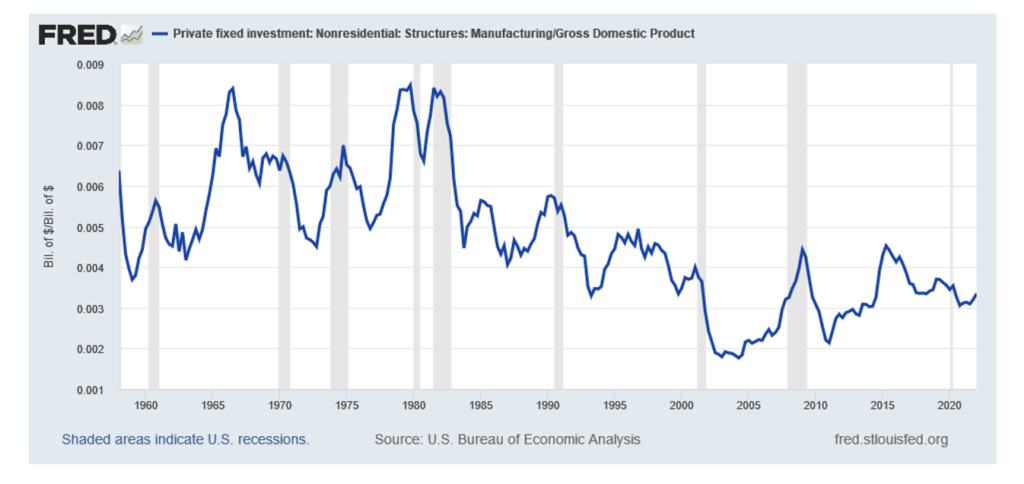 On the positive side, it appears to be bottoming and heading up relative to GDP.  Manufacturing Structures Investment shows a similar tale: