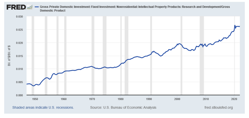 In support of achieving this goal, the key metric for the United States continues to flash a strong green signal.  That stems from US R&D spending, which continues its 70+ year upswing relative to GDP and remains tops in the world, despite China’s subsidies of its industry: